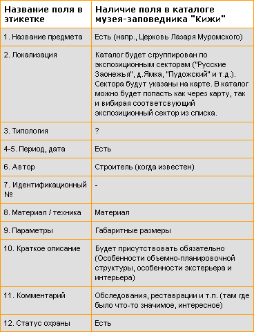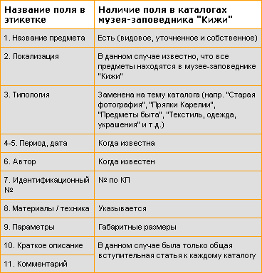 В 2000 г. музей-заповедник получил грант на открытие музейных коллекций (1000 предметов) в сети Интернет. В результате было создано несколько тематических интернет-каталогов. Какие поля были представлены в данных каталогах и насколько они соответствовали выбранным для общей этикетки?