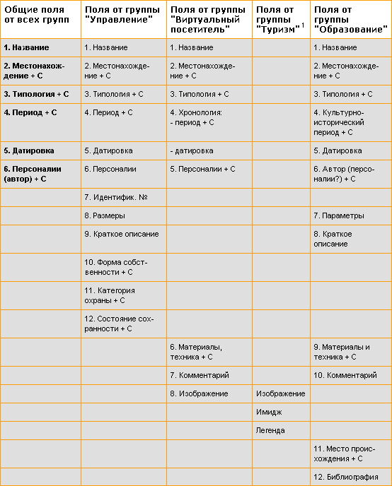 Результаты этой работы приводятся в сводной таблице ("+С" означает обязательность словарного обеспечения для поля):